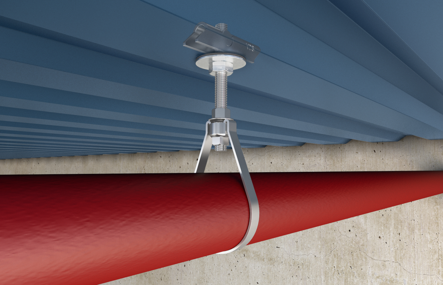 Kotva pro bezpečné upevnění sprinklerového potrubí na stropy z trapézových plechů
