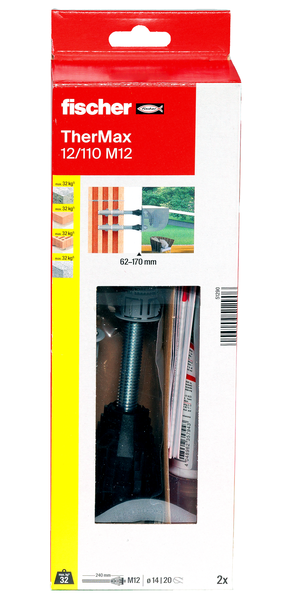 TherMax 12 je certifikovaný systém s přerušeným tepelným mostem pro distanční kotvení do kontaktních zateplených fasád (ETICS) s tloušťkou izolační vrstvy od 62 do 170 mm. V kombinaci s fischer injektážními chemickými maltami je vhodný do betonu, plného i děrovaného zdiva a pórobetonu. Kotevní tyče jsou vybavené speciální protichladovým kuželem z tvrzeného plastu vyztuženého skelnými vlákny, který si při montáži sám vyfrézuje lůžko skrz omítku do vrstvy izolantu. Užitnou délku TherMaxu lze plynule nastavit, takže nerovný povrch nepředstavuje žádné obtížnosti. Používá se k upevnění těžších předmětů jako markýzy, klimatizační jednotky, disky satelitních přijímačů apod.