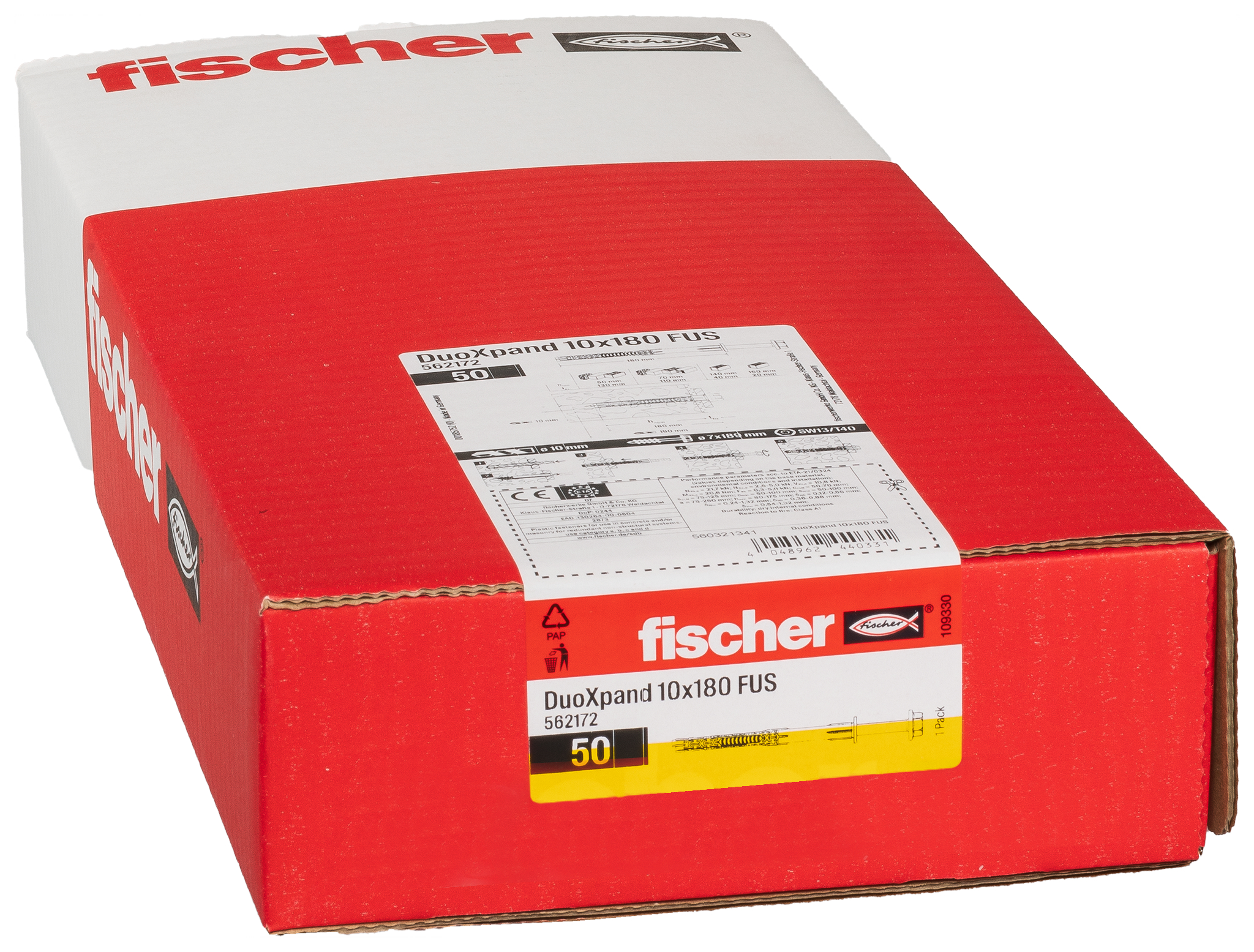 Rámová hmoždinka fischer DuoXpand je certifikovaná pro vícenásobné kotvení nenosných systémů do betonu a plného, děrovaného i plynosilikátového zdiva. Při kotvení lze využít dvou certifikovaných kotevních hloubek 50 a 70 mm. Materiálově kombinované plastové tělo hmoždinky s optimalizovaným tvarem bezpečnostního šroubu zaručuje poměrně vysokou únosnost v hutných stavebních materiálech a výjimečnou šetrnost při použití do křehkých a měkkých stavebních materiálů. Vyrábí se v průměrech 8 a 10 mm s maximální délkou 230 mm. Varianta se šestihrannou hlavou s integrovanou podložkou je vhodná k upevnění kovových konstrukcí.