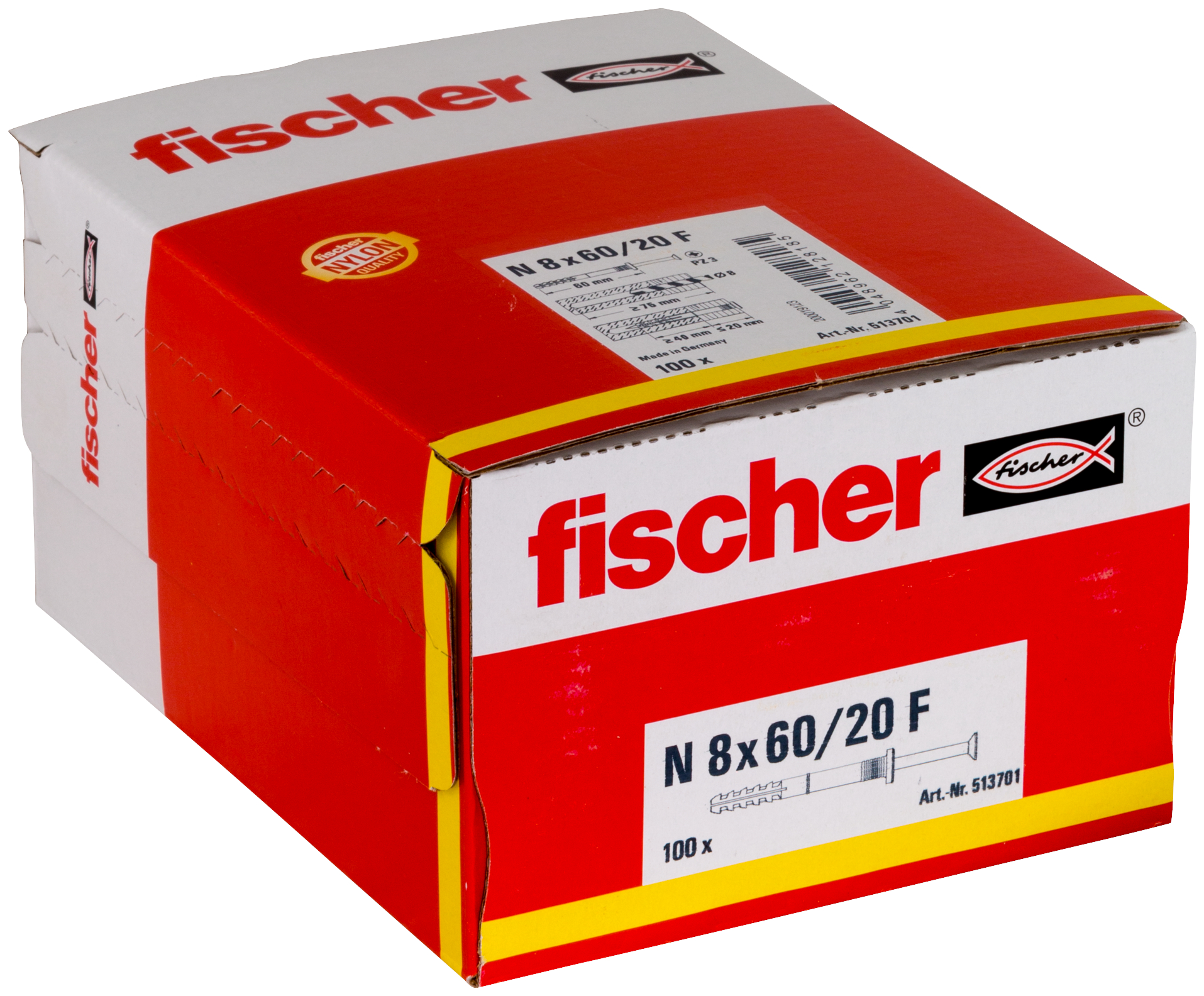 Natloukací hmoždinka fischer s válcovou hlavou N-F se skládá z vysoce kvalitního nylonového těla a hřebu se zápustnou hlavou z nerezové nebo galvanicky zinkované oceli. Obě části jsou kvůli úspoře času předmontované. Hmoždinka se aplikuje rychlou průvlečnou montáží. Hřeb se zatluče, tělo hmoždinky se roztáhne a bezpečně se zapře o stěny otvoru. Natloukací hmoždinka N-F je vhodná k upevnění lehkých kovových konstrukcí a profilů na beton a jiné plné stavební materiály.