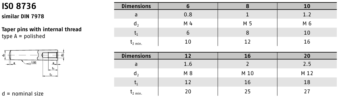 Kolíky DIN 7978 jsou kuželové kolíky s vnitřním závitem, které slouží k pevnému a přesnému spojení součástí. Díky svému kuželovitému tvaru zajišťují samosvornost ve spoji a vnitřní závit umožňuje další zajištění pomocí šroubů nebo jiných spojovacích prvků.