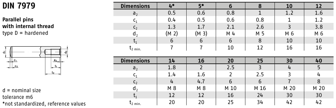 Kolíky DIN 7979D jsou kalené válcové kolíky s vnitřním závitem, které slouží k pevnému a přesnému spojení součástí. Díky své vysoké tvrdosti a přesnému závitu zajišťují spolehlivé uchycení a odolnost proti vibracím.