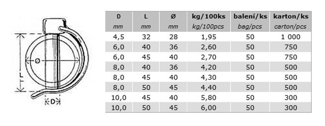 Kolík pojistný trubkový (zajišťovací, trubkový kolík, kruhová závlačka, lynch pin), pojistný kolík k zajištění trubkových rozebíratelných spojů.