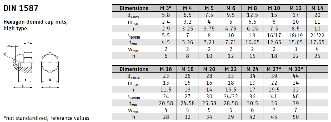 Matice DIN 1587 jsou šestihranné uzavřené matice s kopulovitou hlavou, které chrání konce šroubů před poškozením, znečištěním a korozí. Díky uzavřenému tvaru zlepšují vzhled šroubového spoje a snižují riziko poranění o vyčnívající závit. Používají se ve strojírenství, stavebnictví, nábytkářském průmyslu a designových aplikacích. Vyrábějí se z oceli, nerezové oceli nebo mosazi s různými povrchovými úpravami, například pozinkováním. Matice DIN 1587 jsou ideální pro spoje, které vyžadují ochranu i estetické dokončení.