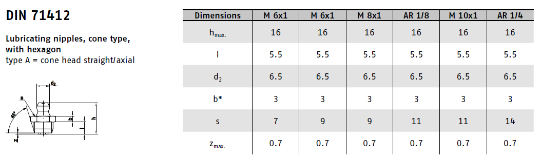Norma DIN 71412 specifikuje rozměry a provedení kuželových maznic. Tyto maznice slouží k dodávání maziva do těžko přístupných míst strojních zařízení a jsou nezbytné pro zajištění jejich dlouhé životnosti a bezproblémového chodu. Provedení A je přímá 180st., provedení B je pod úhlem 45st., provedení C je pod úhlem 90st.