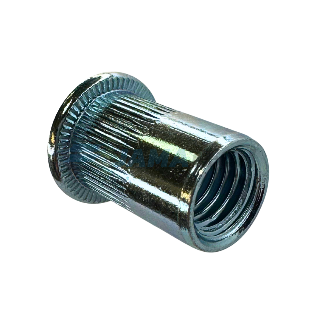 Nýtovací matice s plochou hlavou a rádlovaným tělem proti protočení matice v díře. Nejběžnější materiály jsou zinkovaná ocel, nerez nebo hliník.