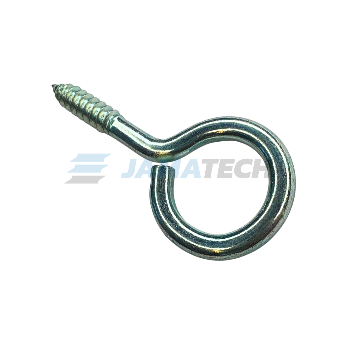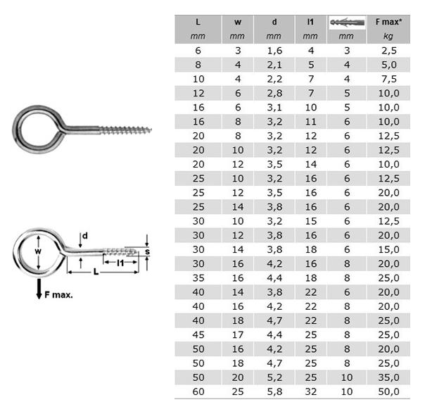 Oko s vrutovým závitem. První údaj uvádí celkovou délku dříku, druhý údaj uvádí vnitřní průměr oka a třetí údaj uvádí průměr drátu.