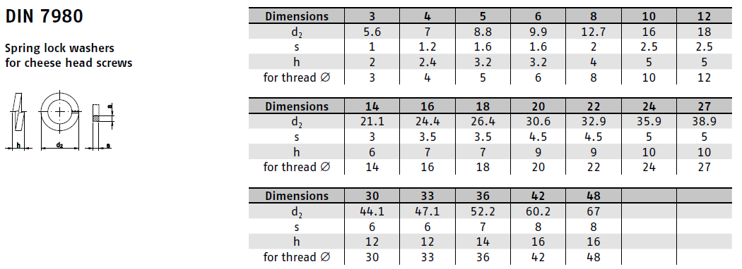 DIN 7980 označuje speciální typ podložky se čtvercovým průřezem, která je určena pro šrouby s válcovou hlavou a je navržena tak, aby zajistila pevnost a odolnost šroubových spojů, zejména v podmínkách vibrací nebo střídavého zatížení. Díky svému tvaru a materiálu se podložka pruží a vytváří tak konstantní přítlak na šroub, čímž zabraňuje jeho samovolnému povolení.