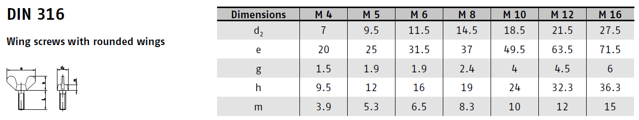 DIN 316 je norma pro křídlové šrouby. Typ AF značí lisovaná křídla a GT jsou litá a zaoblená. Tyto šrouby mají hlavu s křídly, což umožňuje ruční utahování a povolování bez použití nářadí. Jsou ideální pro aplikace, kde je potřeba častá manipulace se spojem.