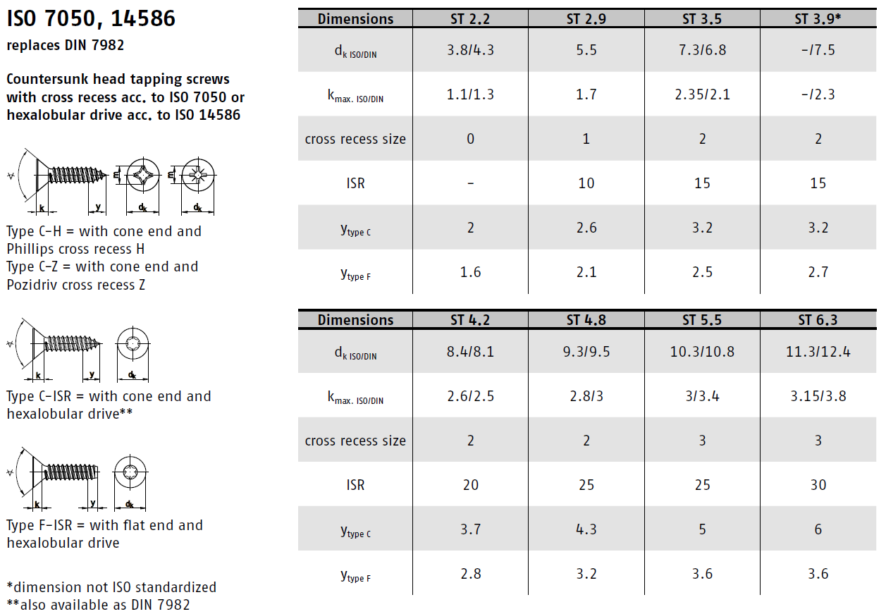 DIN 7982C je norma pro šrouby do plechu se zápustnou hlavou a křížovou drážkou (Phillips). Tyto šrouby jsou navrženy tak, aby se po utažení hlava šroubu zapustila do materiálu a lícovala s jeho povrchem. Jsou ideální pro spojování plechů a jiných tenkých materiálů, kde je vyžadován estetický vzhled a pevné spojení.