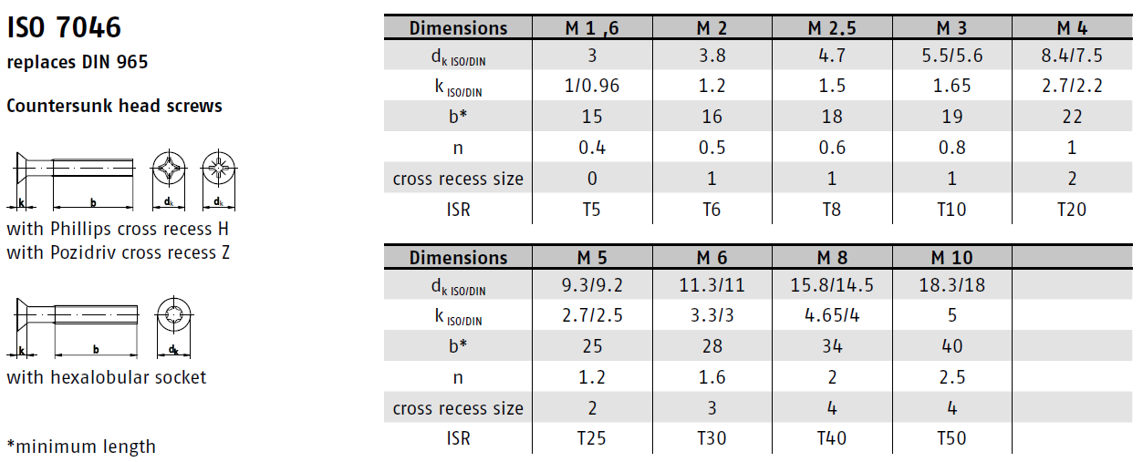 DIN 965 je norma pro šrouby se zápustnou hlavou a křížovou drážkou (Phillips). Tyto šrouby jsou navrženy tak, aby jejich hlava po utažení lícovala s povrchem materiálu, což zajišťuje estetický a funkční vzhled. Jsou vhodné pro širokou škálu aplikací, kde není vyžadována extrémní pevnost spoje.