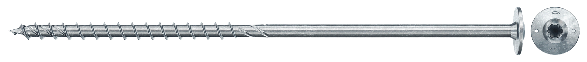Výkonný vrut pro konstrukční spoje dřevostaveb s talířovou hlavou, částečným závitem a drážkou TX