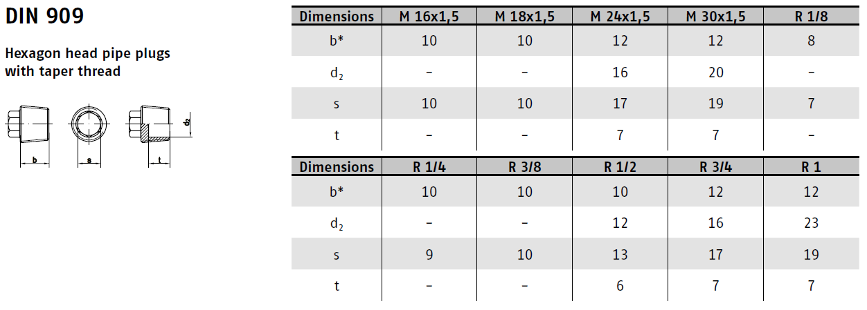 DIN 909 je norma specifikující zátku s vnějším šestihranem a kuželovým závitem. Tyto zátky se primárně používají pro uzavírání otvorů v nádržích, nádobách nebo strojních součástech, kde je vyžadováno těsné a spolehlivé uzavření.